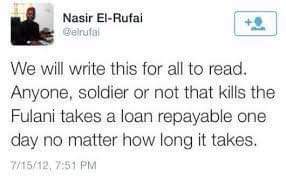 “We will write this for all to read. Anyone, soldier or not that kills the Fulani takes a loan repayable one day no matter how long it takes.”
